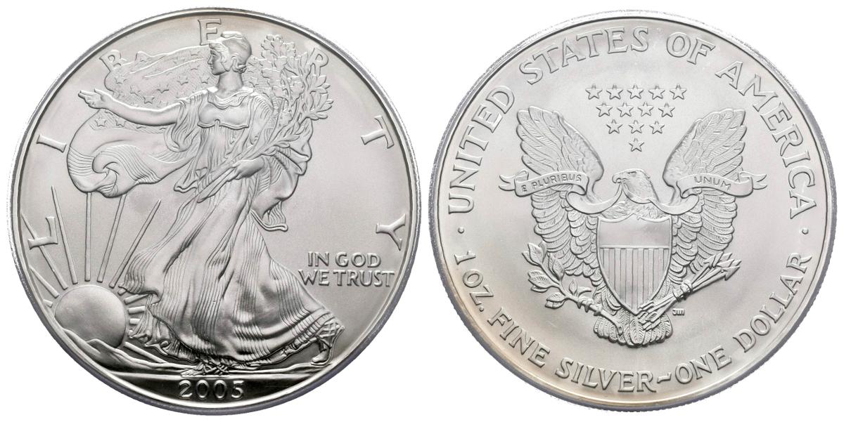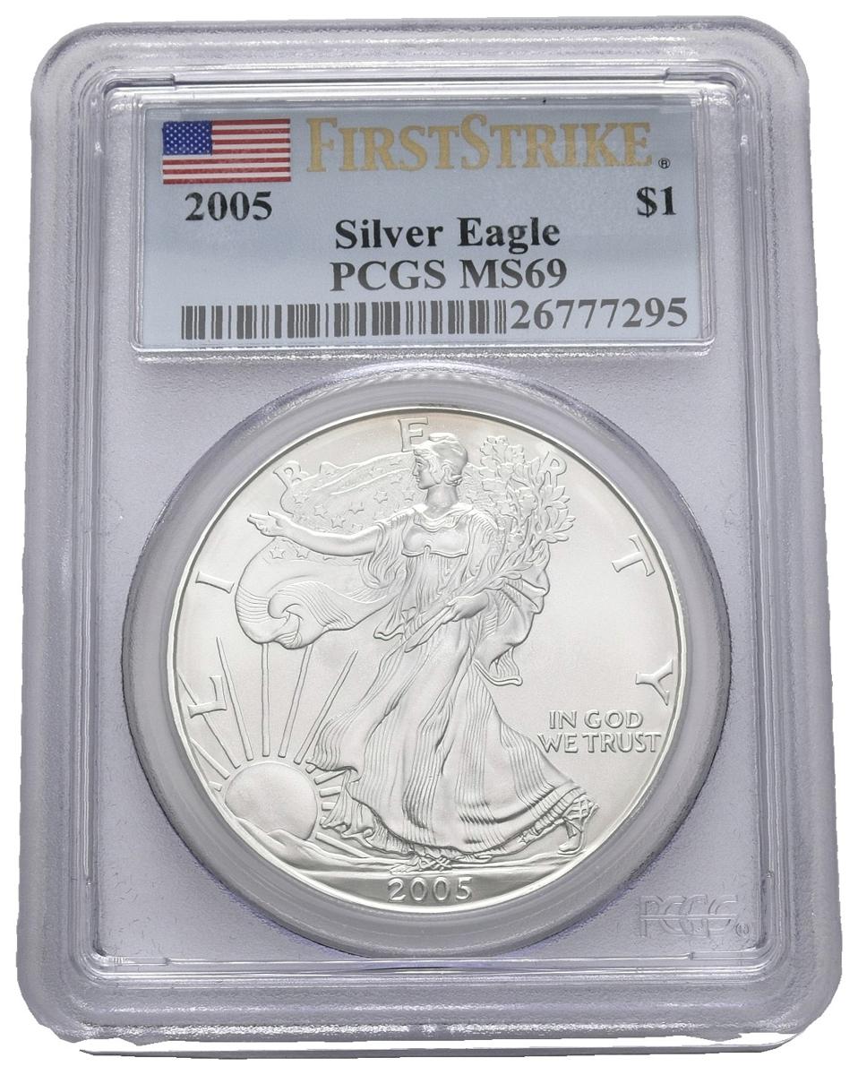 ESTADOS UNIDOS. 1 Dollar (Ar.31,00g/41mm)*. 2005. Sin Marca de Ceca. Silver Eagle. First Strike. (Km#273). MS 69. Encapsulada por PCGS. *Peso y medida teórico.