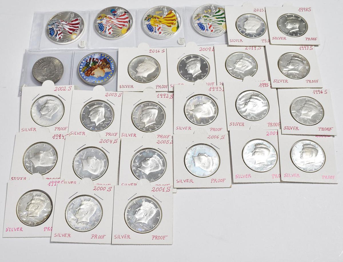 ESTADOS UNIDOS. Conjunto compuesto por 27 monedas de plata de las cuales 21 corresponden al módulo en plata de 1/2 dollar Proof, acuñados entre 1992 y 2016 en San Francisco. Las 6 monedas restantes son 5 piezas de 1 dollar y otra de 1/2 dollar coloreadas. SC. A EXAMINAR.
