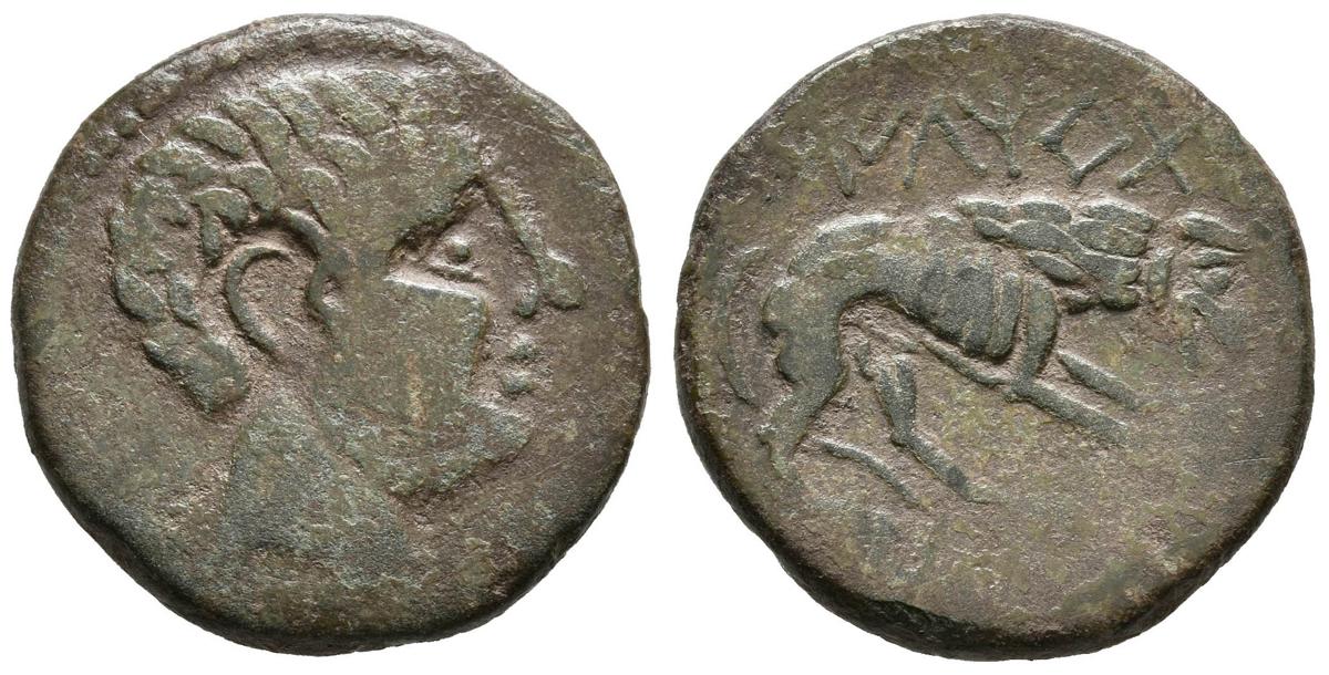 ILTIRTA (Lérida). As. (Ae. 6,92g/22mm). 200-20 a.C. (FAB-1476). Anv: Cabeza masculina a derecha. Rev: Lobo saltando a derecha, encima leyenda ibérica: ILTiRTa. MBC-.