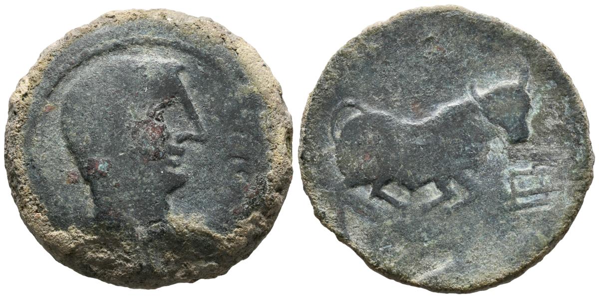 IPORA (Montoro, Córdoba). Dupondio. (Ae. 28,26g/34mm). 50 a.C. (FAB-1567). Anv: Cabeza masculina a derecha, delante leyenda: IPORA. Rev: Toro a derecha, delante pesebre. MBC-.