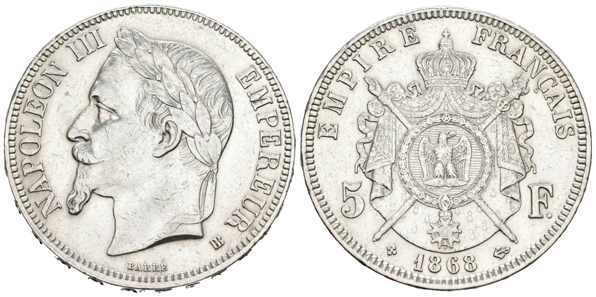FRANCIA. 5 Francs (Ar. 24,98g/37mm). 1868. Napoleón III. Estrasburgo BB. (Km#799.2). MBC.