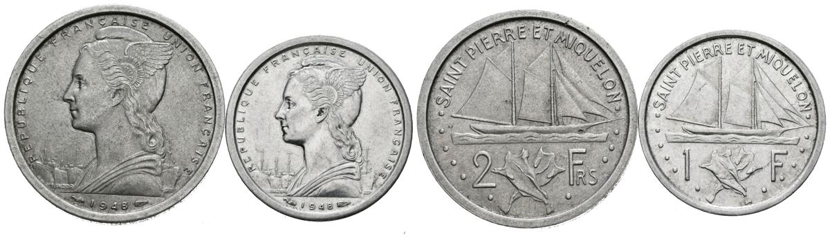 SAN PEDRO Y MIQUELÓN. Conjunto de 1 y 2 Francs acuñados en 1948 en aluminio y ambas en alto grado de conservación. A EXAMINAR