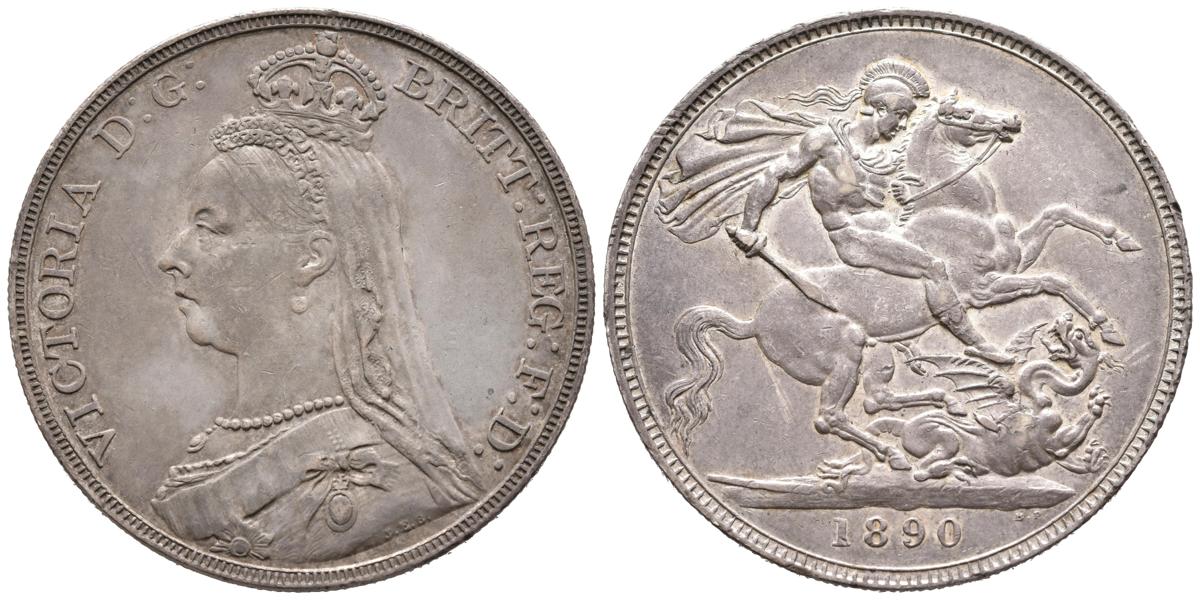 REINO UNIDO. 1 Crown (Ar. 28,26g/39mm). 1890.Reina Victoria. (Km#765). MBC+. Pátina oscura.