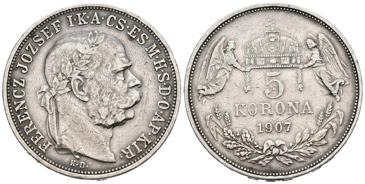 HUNGRIA. 5 Coronas. (Ar. 23,91/36mm). 1907. Ferencez Jozsef. (Km#488). MBC.