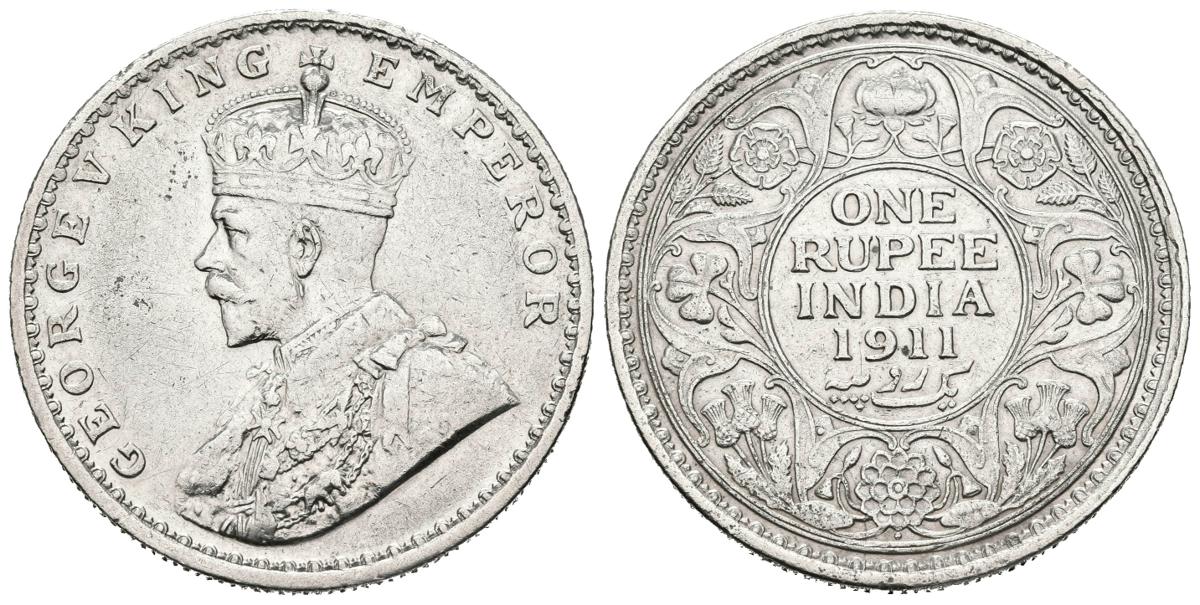INDIA (Británica). 1 Rupia (Ar. 11,55g/31mm). 1911. Jorge V. Bombay B. (Km#523). Pig rupee. MBC+. Limpiada. Escasa. Estas monedas fueron mandadas a destruir debido al mal diseño del elefante del anverso que se asemejaba más a un cerdo que a un elefante. De ahí su escasez.