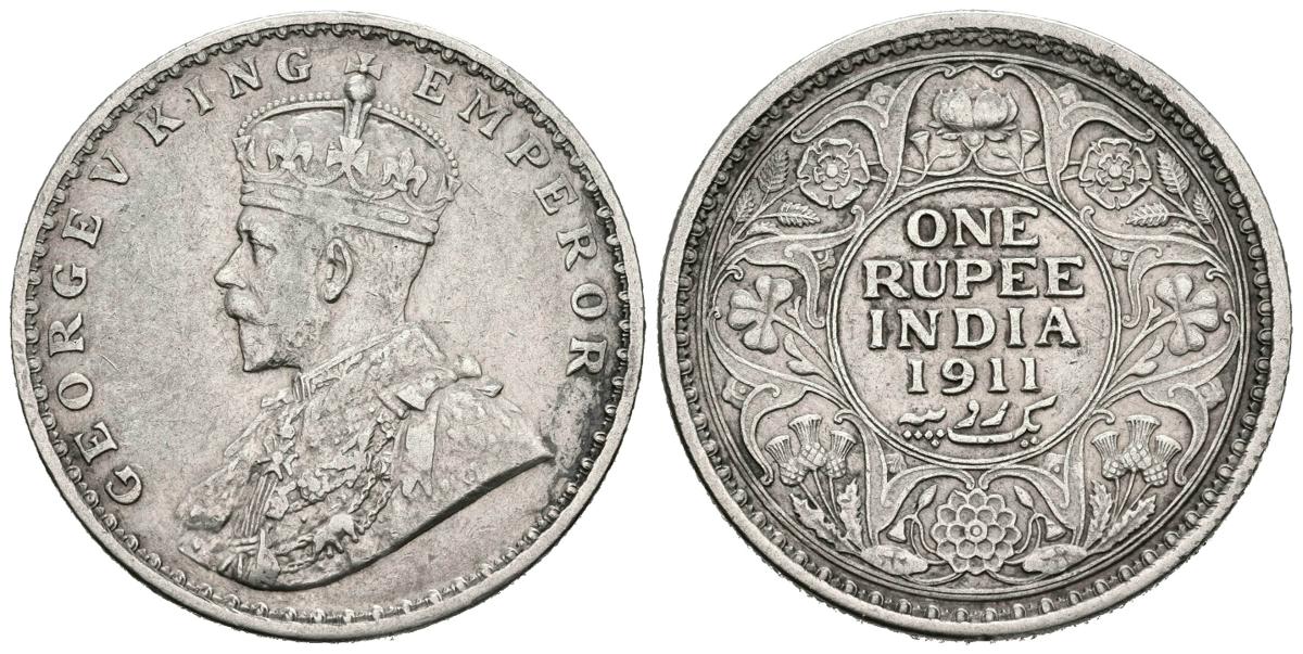 INDIA (Británica). 1 Rupia (Ar. 11,60g/31mm). 1911. Jorge V. Calculta. Sin marca de ceca. (Km#523). Pig rupee. MBC/MBC+. Escasa. Estas monedas fueron mandadas a destruir debido al mal diseño del elefante del anverso que se asemejaba más a un cerdo que a un elefante. De ahí su escasez.
