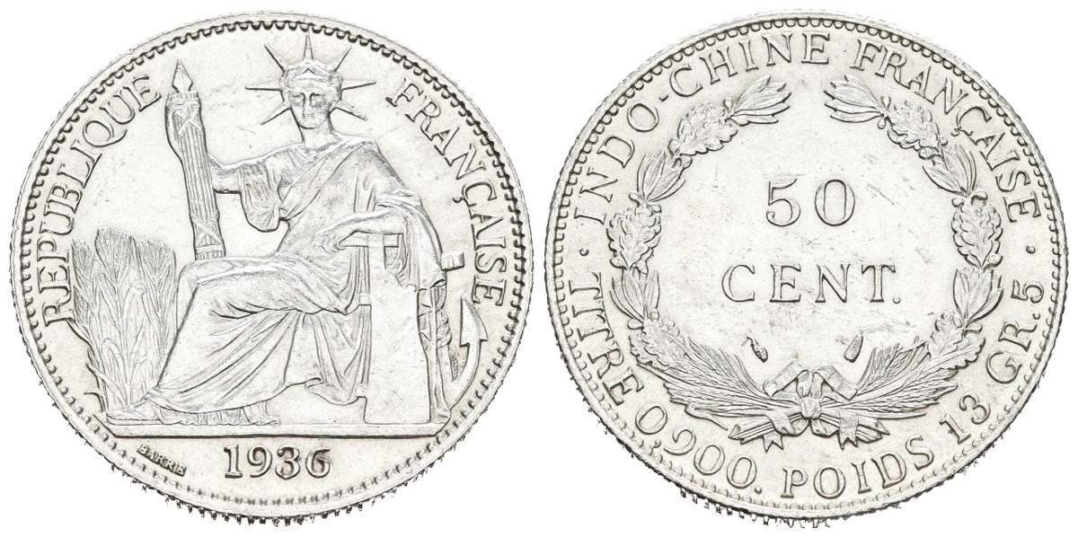INDOCHINA (Francesa). 50 Cents (Ar. 13,51g/29mm). 1936. (Km#4a.2). EBC. Limpiada