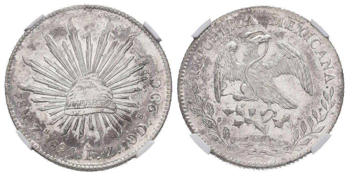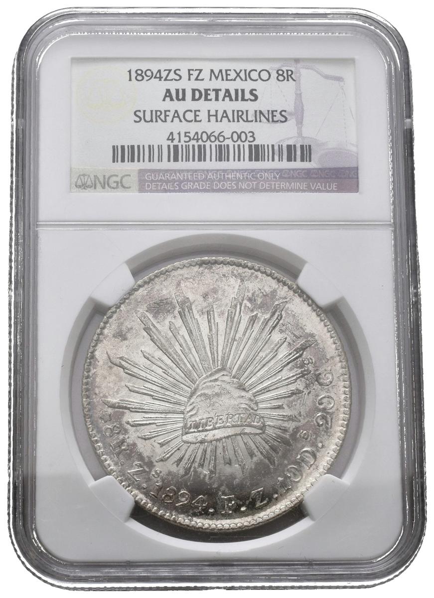 MÉXICO. 8 Reales (Ar. 27,00g/39mm)*. 1894. Zacatecas FZ. (Km#377.13). AU DETAILS. Rayitas superficiales. Encapsulado por NGC. *Peso y medida teóricos.