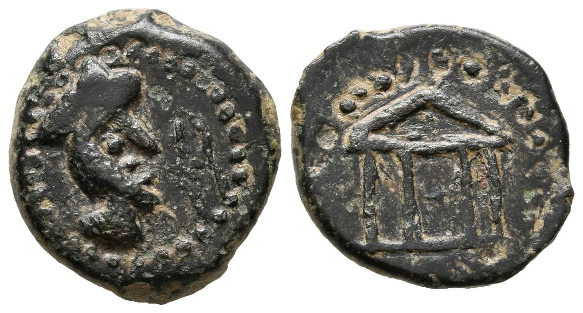MALACA (Málaga). Cuadrante. (Ae. 3,28g/16mm). 200-20 a.C. (FAB-1741). Anv: Cabeza de Vulcano a derecha, delante tenazas. Rev: Templo tetrástilo. MBC.