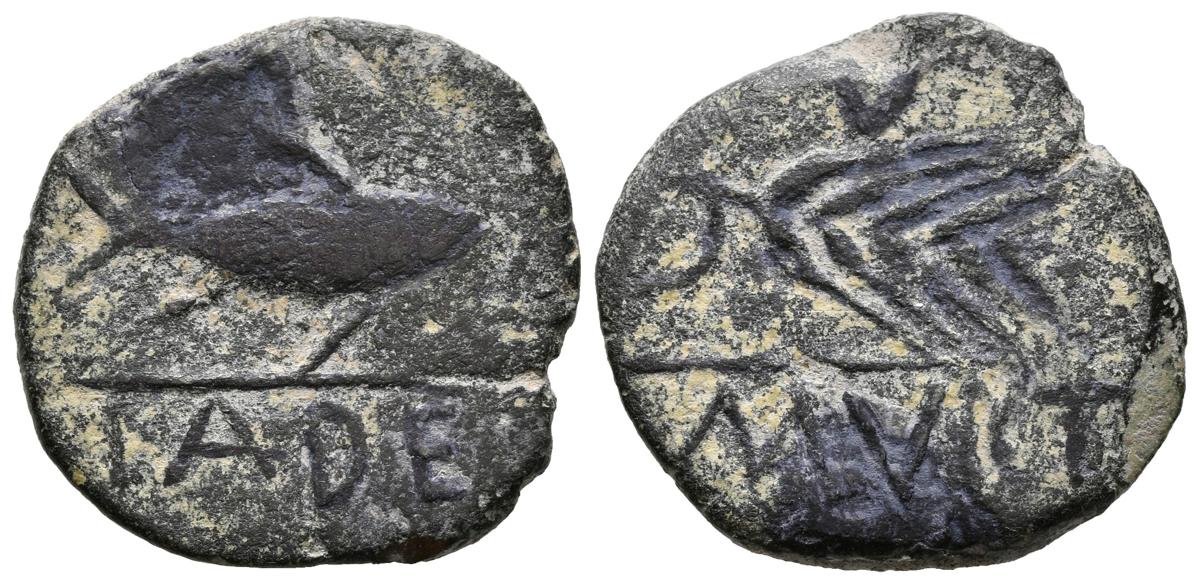 MURTILIS (Mértola, Portugal). As. (Ae. 5,43g/23mm). 120-50 a.C. (FAB-1761). Anv: Atún a derecha, debajo leyenda: L A DE C. Rev: Espiga a derecha, encima A retrógada, debajo leyenda: MVRTI. MBC-.