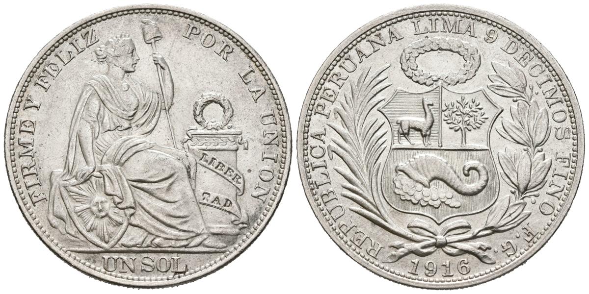 PERÚ. 1 Sol (Ar. 24,98g/37mm). 1916. Lima FG. (Km#196). EBC-.