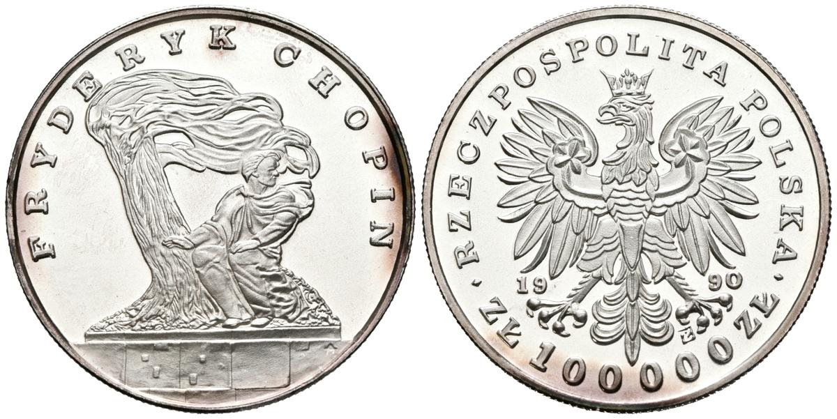 POLONIA. 100.000 Zlotych (Ar. 31,15/39mm). 1990. 180 Aniversario del Nacimiento de Frederic Chopin. (Km#199). PROOF. Escasa.