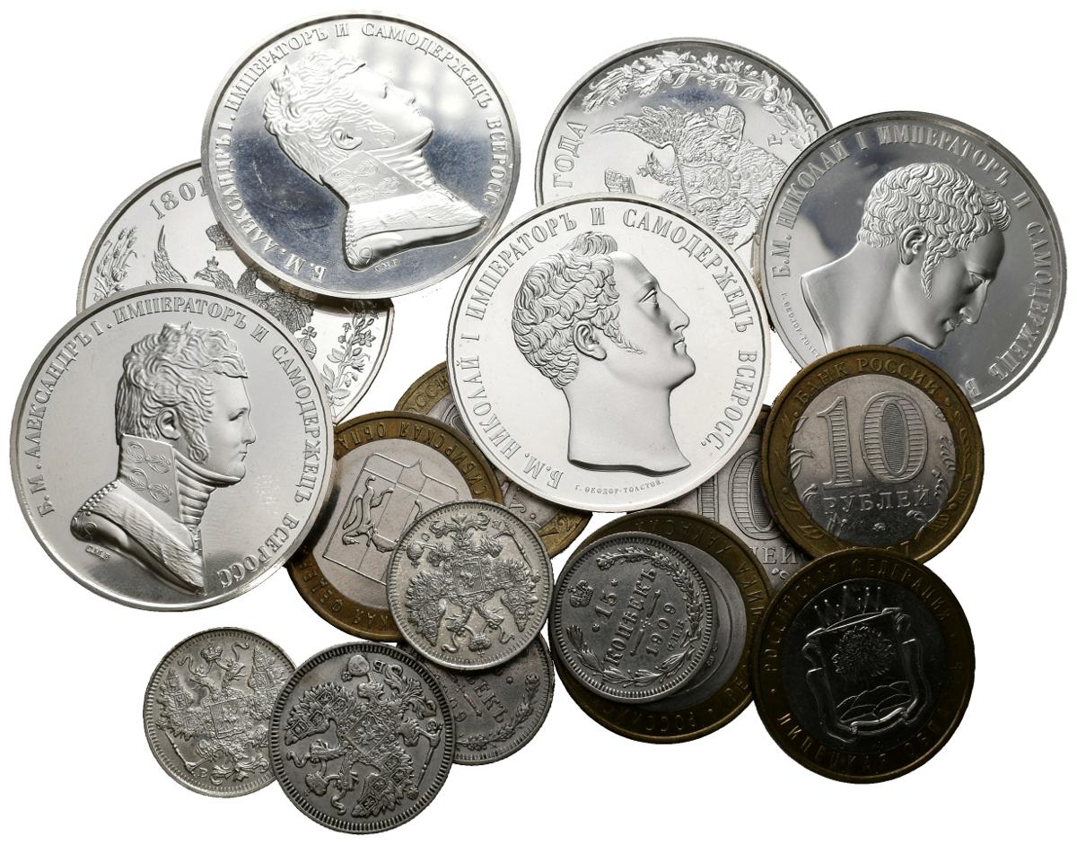 RUSIA. Interesante conjunto formado por 17 monedas dividas en 3 bloques: el primero compuesto por 5 piezas de 15 y 20 Kopkes acuñado en 1909 y 1915; el segundo por 6 monedas conmemorativas de 1 y 1/2 Rublo en plata (25,5 gramos de media por pieza) y un tercer bloque formado por 6 monedas contemporáneas de 10 Rublos de diferentes cecas y acuñadas entre 2005 y 2007. Alto estado de conservación en general. A EXAMINAR.