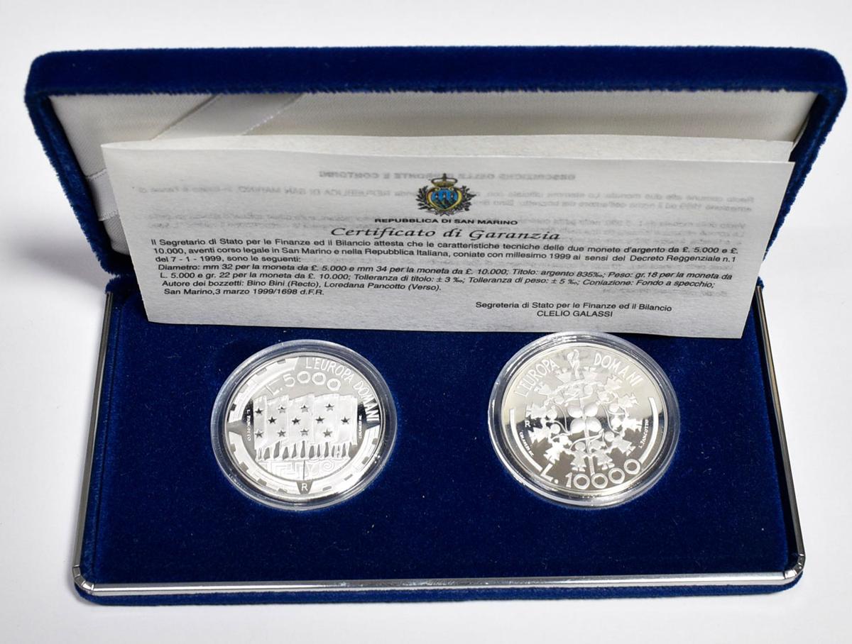 SAN MARINO. Conjunto compuesto por 2 monedas de 5000 y 10.000 liras en plata. L´Europa Domani. 40g en total en plata. 1999. Roma. Proof. Incluye estuche original y certificado de autenticidad.