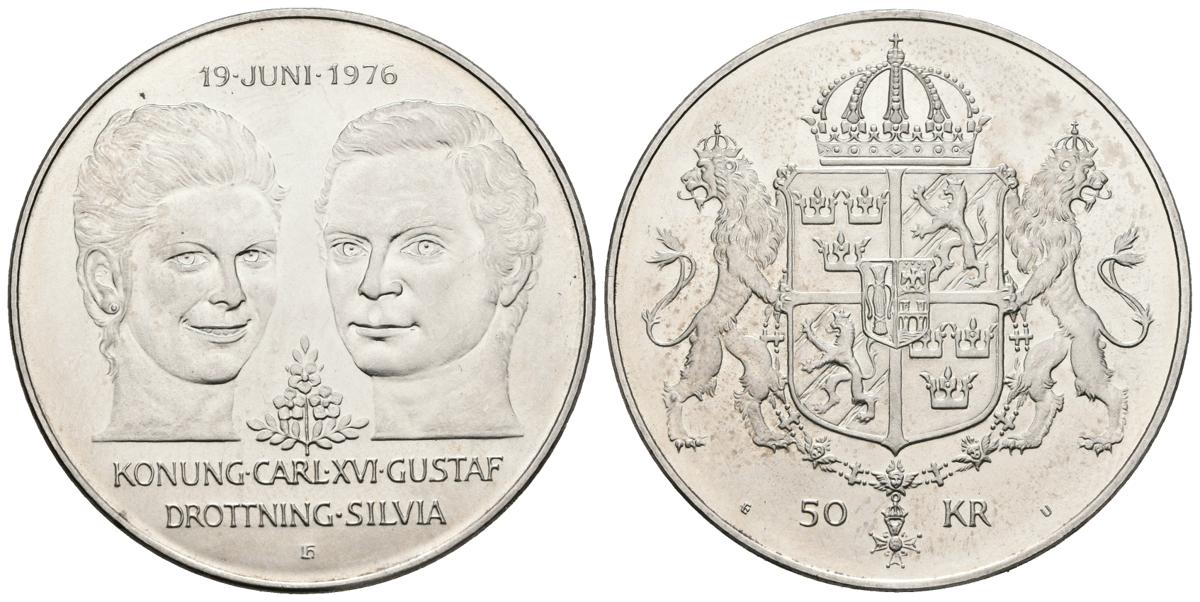 SUECIA. 50 Coronas (Ar. 26.86g/36mm). 1976. Boda del rey Carlos XVI Gustavo y la reina Silvia. (Km#854). EBC+.