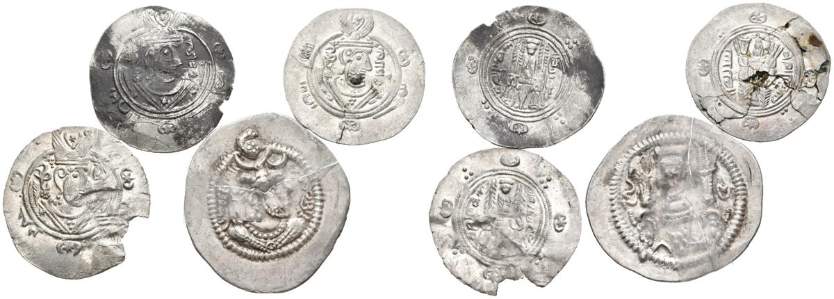 IMPERIO SASANIDA. Conjunto de 4 monedas de plata, de las cuales 3 Hemidracmas y 1 Dracma (partido) de diferentes reyes sasanidas, cecas y años. A EXAMINAR.