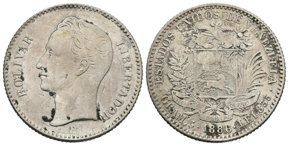 ESTADOS UNIDOS DE VENEZUELA. 1 Bolívar. (Ar. 4,82g/23mm). 1886. Caracas. (Km#Y22). BC+. Rayas en anverso.