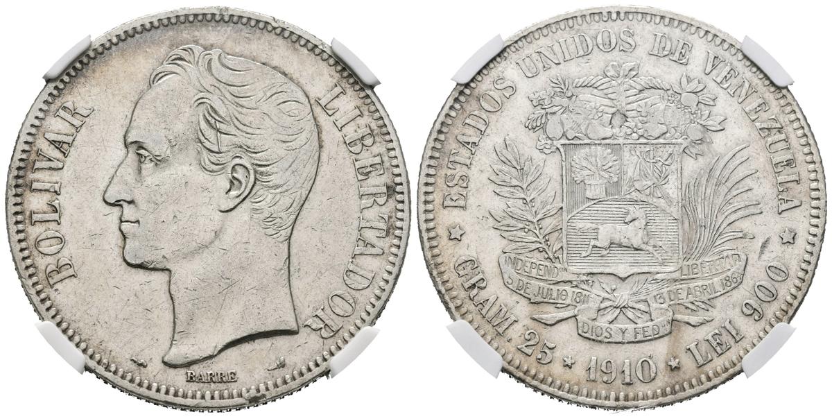 ESTADOS UNIDOS DE VENEZUELA. 5 Bolívares. (Ar. 25,00g/37mm). 1910. Philadelphia. (Km#Y24.2). Variante "ROUND 0". Encapsulado NGC XF Details. Rayitas superficiales.