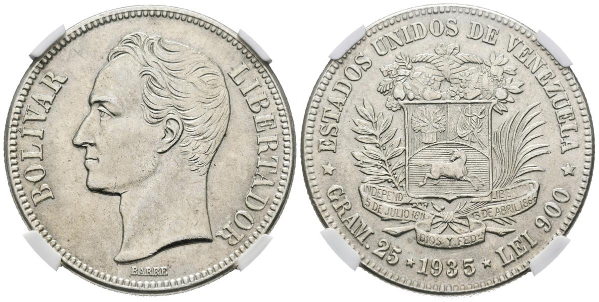 ESTADOS UNIDOS DE VENEZUELA. 5 Bolívares. (Ar. 25,00g/37mm). 1935. Philadelphia. (Km#Y24.2). Encapsulado NGC MS-62.