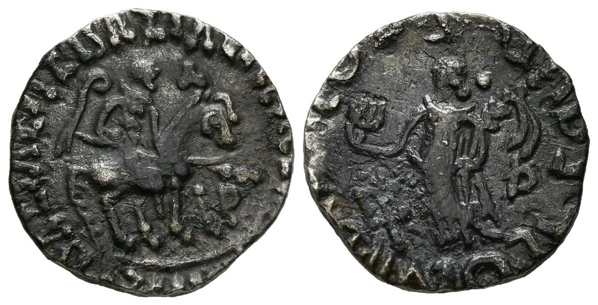 INDOESCITAS, Azes I. Dracma. (Ar. 2,21g/12mm). 57-35 a.C. (Mitchiner 2270). Anv: Rey sobre caballo a derecha, alrededor leyenda griega. Rev: Diosa avanzando a izquierda portando palma, en campo dos monogramas, alrededor leyenda griega. MBC.