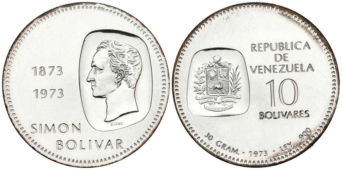 VENEZUELA. 10 Bolívares. (Ar. 30,25g/39mm). 1973. Centenario de la efigie de Simón Bolívar en la moneda (1873-1973). (Km#45). EBC+.