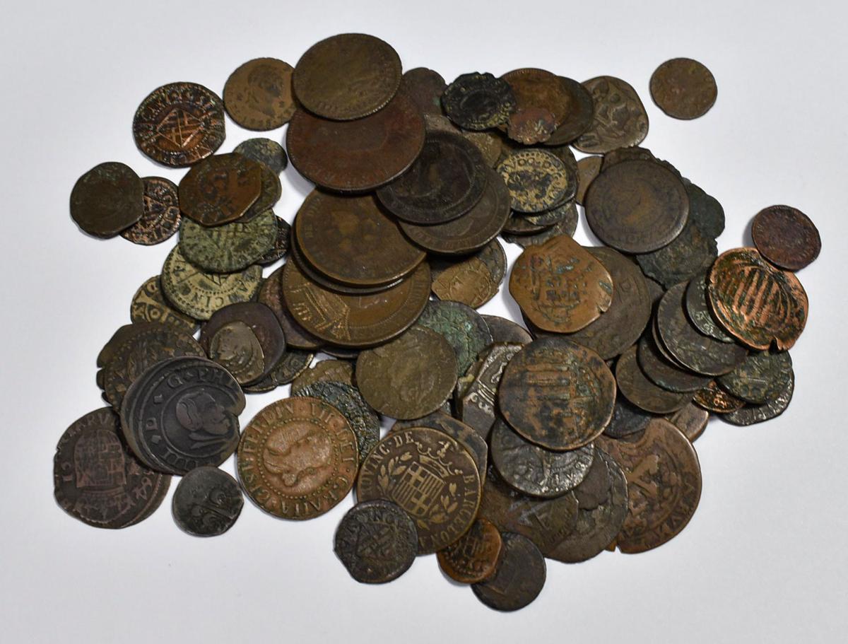 MONARQUÍA ESPAÑOLA. Interesante lote compuesto por más de 100 monedas, entre los que destacan unas 80 monedas de la Corona de Aragón, además de algunos resellos castellanos y otras monedas de cobre y vellón de los siglos XVI-XIX. Diferentes estados de conservación. A EXAMINAR.