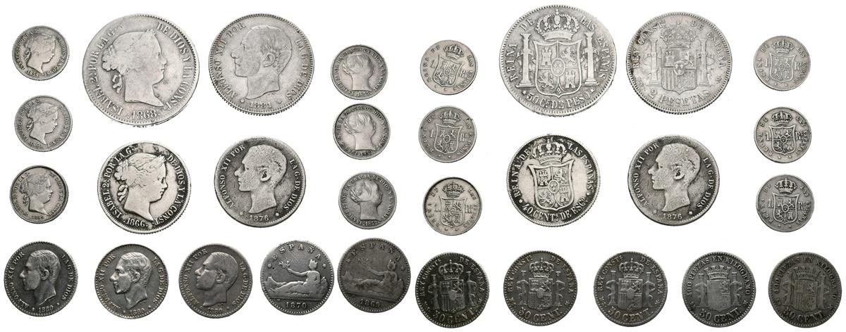 MONARQUIA ESPAÑOLA. Lote compuesto por 15 monedas de plata, de diferentes valores y fechas, pertenecientes al reinado de Isabel II, el Gobierno Provisional y al reinado de Alfonso XII. A EXAMINAR.