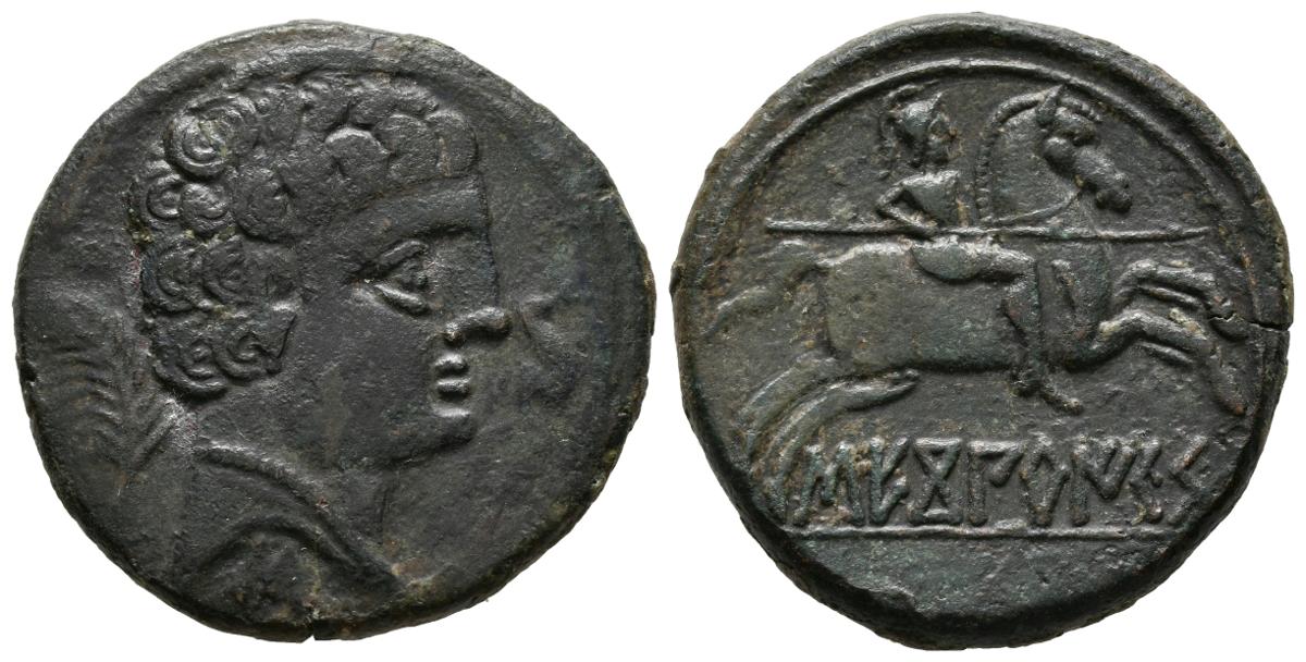 SECOBIRICES (Saelices, Cuenca). As. (Ae. 9,96g/26mm). 120-20 a.C. (FAB-2176). Anv: Cabeza masculina a derecha, detrás espiga, debajo letra ibérica: S, delante delfín. Rev: Jinete con lanza a derecha, debajo leyenda ibérica: SECoBiRICES. MBC/MBC+.
