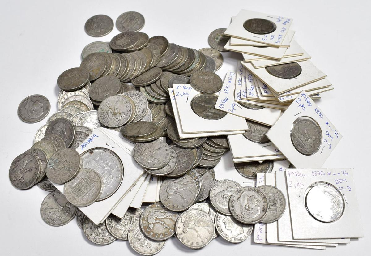 CENTENARIO DE LA PESETA. Conjunto compuesto por 159 monedas de plata, de las cuales 4 son de 5 Pesetas y 155 son de 2 Pesetas, todas ellas comprendidas entre el Gobierno provisional y el reinado de Alfonso XII. A EXAMINAR.