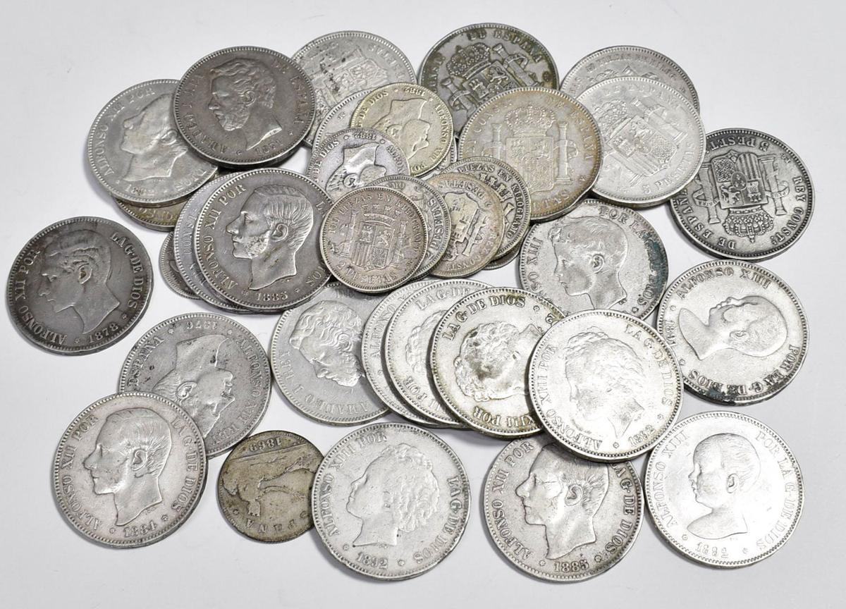 CENTENARIO DE LA PESETA. Lote compuesto por 37 monedas de plata de diferentes módulos del Centenario de la peseta, entre los que destacan 25 monedas de 5 pesetas (peso total en plata del conjunto: 715g). Diferentes estados de conservación. A EXAMINAR.