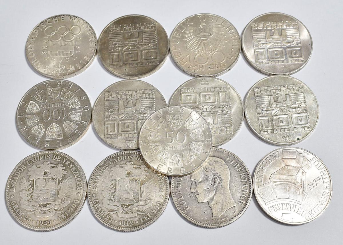 Magnífico conjunto de 13 monedas extranjeras de plata, 10 de Austria (9 de 100 Schilling y 1 de 50, acuñados en la década de los 70 del siglo pasado) y 3 piezas de 5 Bolivares de Venezuela (1910, 1911 y 1929). Peso aproximado total en plata 305g. Diferentes estados de conservación. A EXAMINAR.