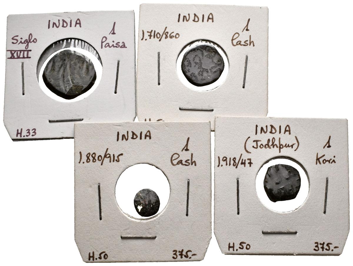 INDIA. Lote de 4 monedas de los siglos XVII, XVIII, XIX y XX. Valores de 1 Paisa, 1 Kori y 1 Cash. Diferentes estados de conservación. A EXAMINAR.