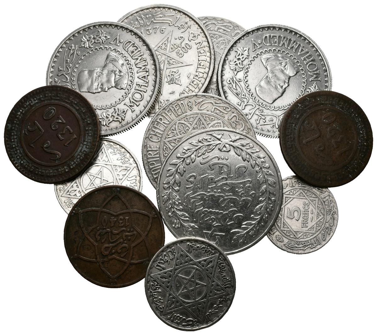 MARRUECOS. Magnifico conjunto compuesto por 12 monedas de fechas comprendidas entre 1902 y 1956. Diferetes valores, módulos y materiales, destacando una mayoría de piezas en plata. Incluye el escaso 1 Rial (10 dirhams) de 1911. Diferentes estados de conservación. A EXAMINAR.