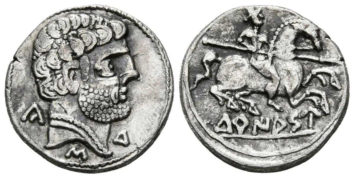 TURIASO (Tarazona, Zaragoza). Denario. (Ar. 3,35g/18mm). 120-20 a.C. (FAB-2412). Anv: Cabeza masculina barbada a derecha, detrás letra: CA, debajo: S y delante: Du. Rev: Jinete con lanza a derecha, debajo leyenda ibérica sobre línea: TuRIASU. MBC.