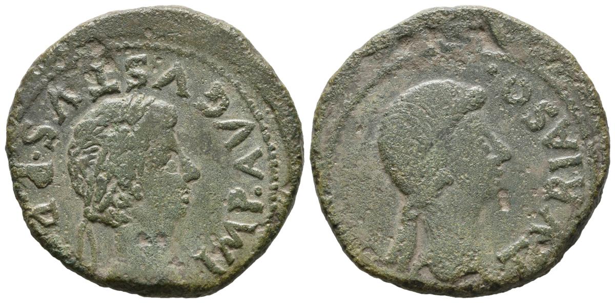 TURIASO (Tarazona, Zaragoza). As. (Ae. 11,31g/29mm). 27 a.C.-14 d.C. (FAB-2435). Anv: Cabeza laureada de Augusto a derecha, alrededor leyenda: IMP AVGVSTVS PP R. Rev: Cabeza femenina a derecha, delante leyenda: TVRIASO. MBC-.