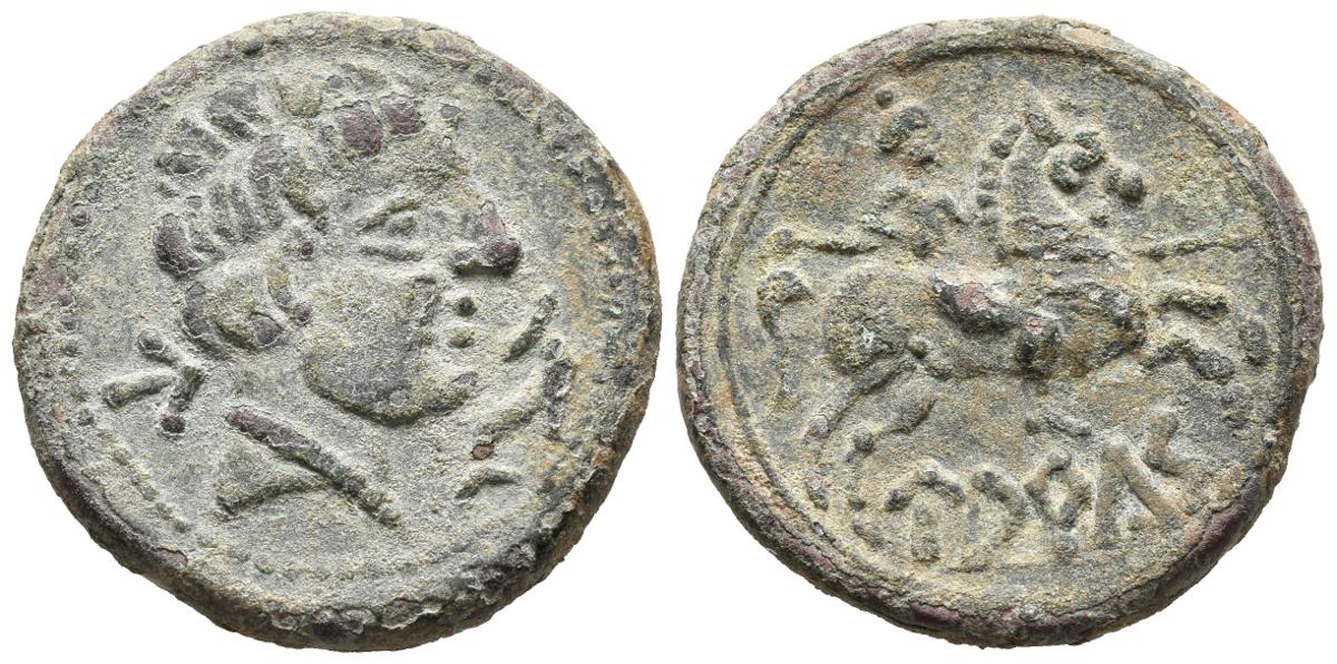 UARCAS (Zona de La Rioja). As. (Ae. 10,29g/26mm). 120-20 a.C. (FAB-2477). Anv: Cabeza masculina a derecha, delante delfín, detrás letra ibérica: U. Rev: Jinete con lanza a derecha, debajo leyenda ibérica: UARCaS. MBC+. Raro y bonito ejemplar.