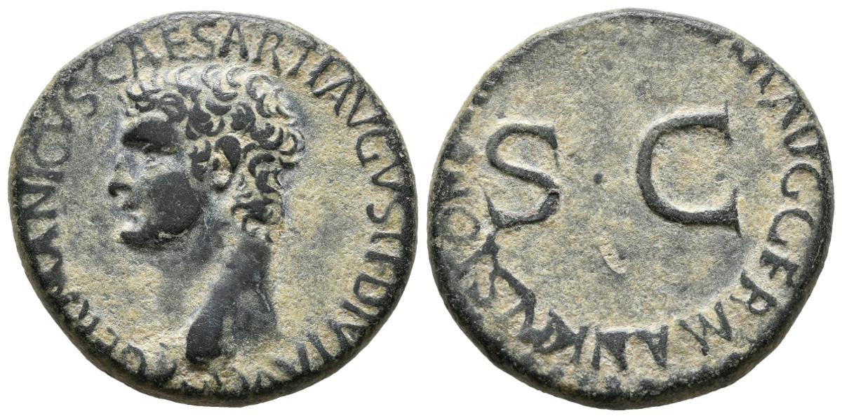 GERMANICO. As. (Ae. 11,08g/26mm). 39-40 d.C. Roma. (RIC 43). Anv: Cabeza de Germánico a izquierda, alrededor leyenda: GERMANICVS CAESAR TI AVGVSTI DIVI AVG NT. Rev: SC, alrededor leyenda: C CAESAR DIVI AVG PRON AVG P M TR P III P P. MBC.