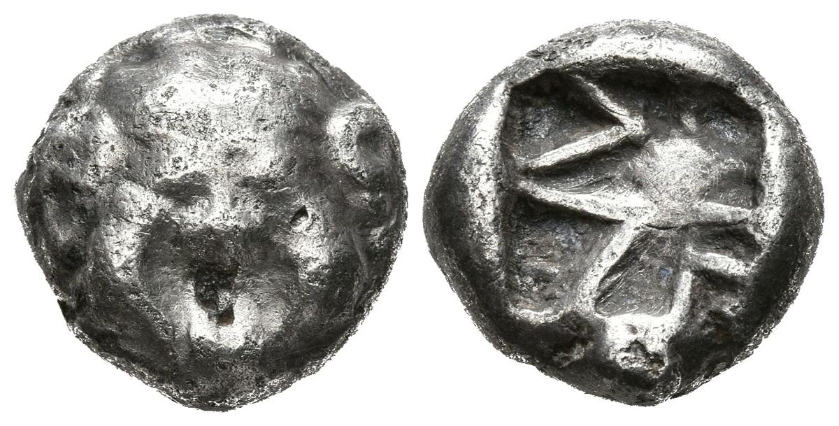 MISIA, Parión. Dracma. (Ar. 3,76g/13mm). Siglo V a.C. (SNG París 1351/2). Anv: Cabeza de Gorgona de frente. Rev: Cuadrado incuso. MBC-.