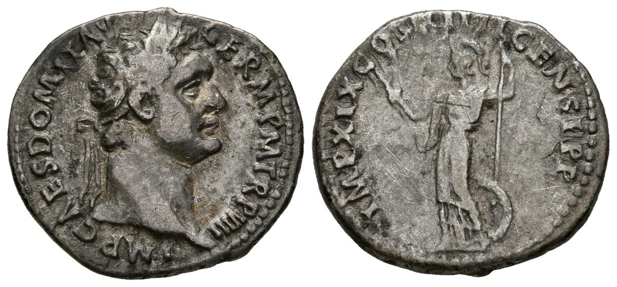 DOMICIANO. Denario (Ar. 3,29g/21mm). 88-89 d.C. Roma. (RIC 134). Anv: Busto laureado de Domiciano a derecha, alrededor leyenda: IMP CAES DOMITAN GERM PM TRP VIII. Rev: Minerva en pie a izquierda con haz de rayos y lanza, a sus pies un escudo, alrededor leyenda: IMP XIX COS XIIII CENS IPP. MBC-.