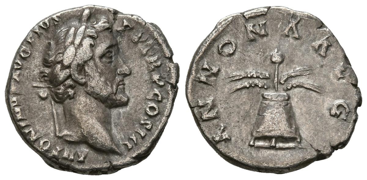 ANTONINO PIO. Denario. (Ar. 2,82g/17mm). 144 d.C. Roma. (RIC 64). Anv: Cabeza laureada de Antonino Pío a derecha, alrededor leyenda: ANTONINVS AVG PIVS P M TR P COS III. Rev: Modio con granos y amapolas, alrededor leyenda: ANNONA AVG. MBC/MBC+.