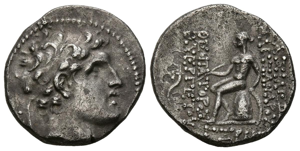 REINO SELEUCIDA, Alejandro I Balas. Dracma. (Ar. 3,93g/18mm). 150-145 a.C. Antioquía. (SNG Spaer 1421). Anv: Cabeza laureada de Alejandro I Balas a derecha. Rev: Apolo sentado sobre omphalos a izquierda sosteniendo flecha y apoyándose sobre arco en el suelo detrás, alrededor leyenda griega, en exergo letras griegas. MBC+.