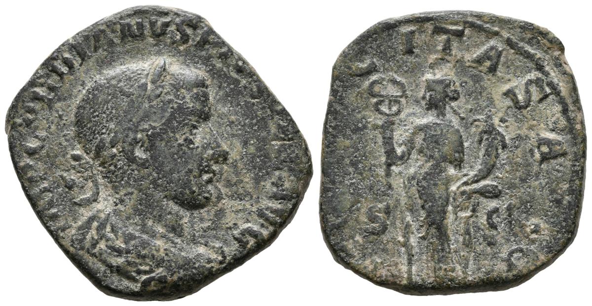 GORDIANO III. Sestercio. (Ae. 15,59g/31mm). 241 d.C. Roma. (RIC 310). Anv: Busto laureado y drapeado de Gordiano III a derecha, alrededor leyenda: IMP GORDIANVS PIVS FEL AVG. Rev: Felicitas estante a izquierda portando caduceo y cornucopia, entre S-C, alrededor leyenda: FELICITAS AVG. MBC-.