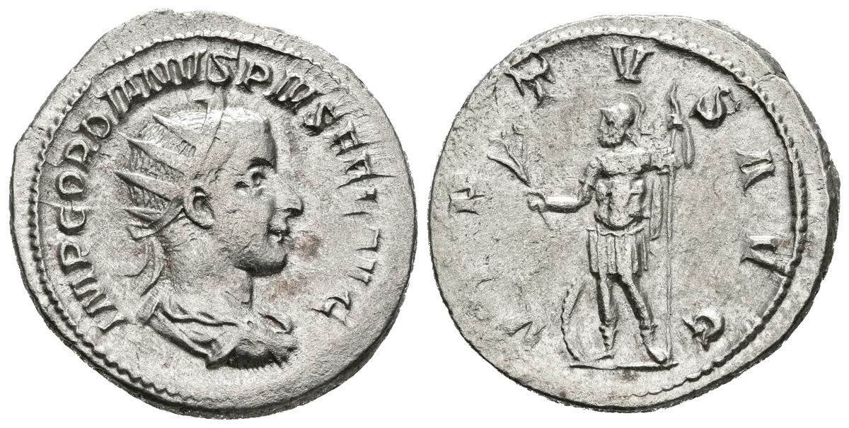 GORDIANO III. Antoniniano. (Ar. 4,49g/23mm). 239 d.C. Roma. (RIC 39). Anv: Busto radiado y drapeado de Gordiano III a derecha, alrededor leyenda: IMP GORDIANVS PIVS FEL AVG. Rev: Virtus estante a izquierda portando rama y lanza, delante escudo, alrededor leyenda: VIRTVS AVG. MBC.