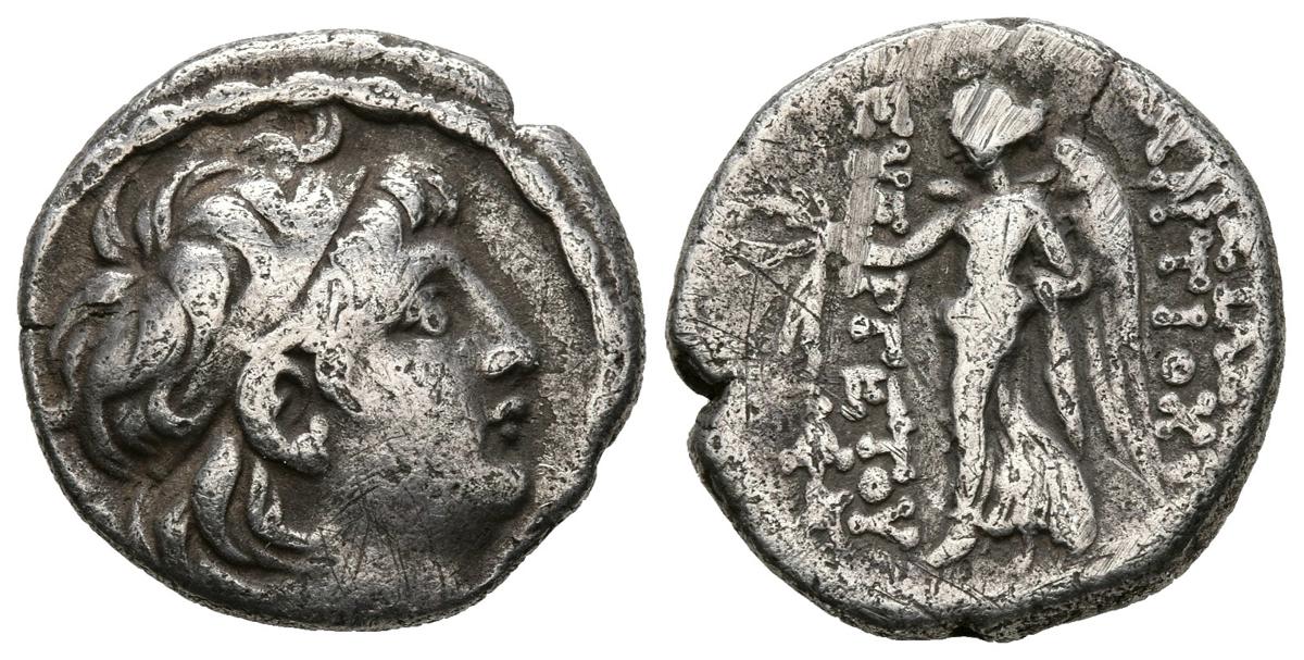 REINO SELEUCIDA, Antiochos VII Euergetes. Dracma. (Ar. 3,80g/17mm). 138-129 a.C. (SNG Spaer 1878). Anv: Cabeza diademada a derecha. Rev: Nike avanzando a izquierda portando corona de laurel, alrededor leyenda griega. MBC-.