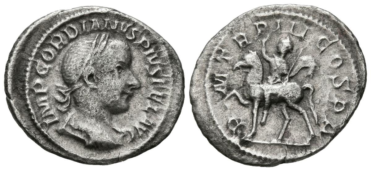 GORDIANO III. Denario. (Ar. 2,61g/22mm). 240 d.C. Roma. (RIC 81). Anv: Busto diademado y drapeado de Gordiano III a derecha, alrededor leyenda: IMP GORDIANVS PIVS FEL AVG. Rev: Gordiano III portando cetro y saludando sobre caballo a izquierda, alrededor leyenda: P M TR P III COS P P. MBC-.