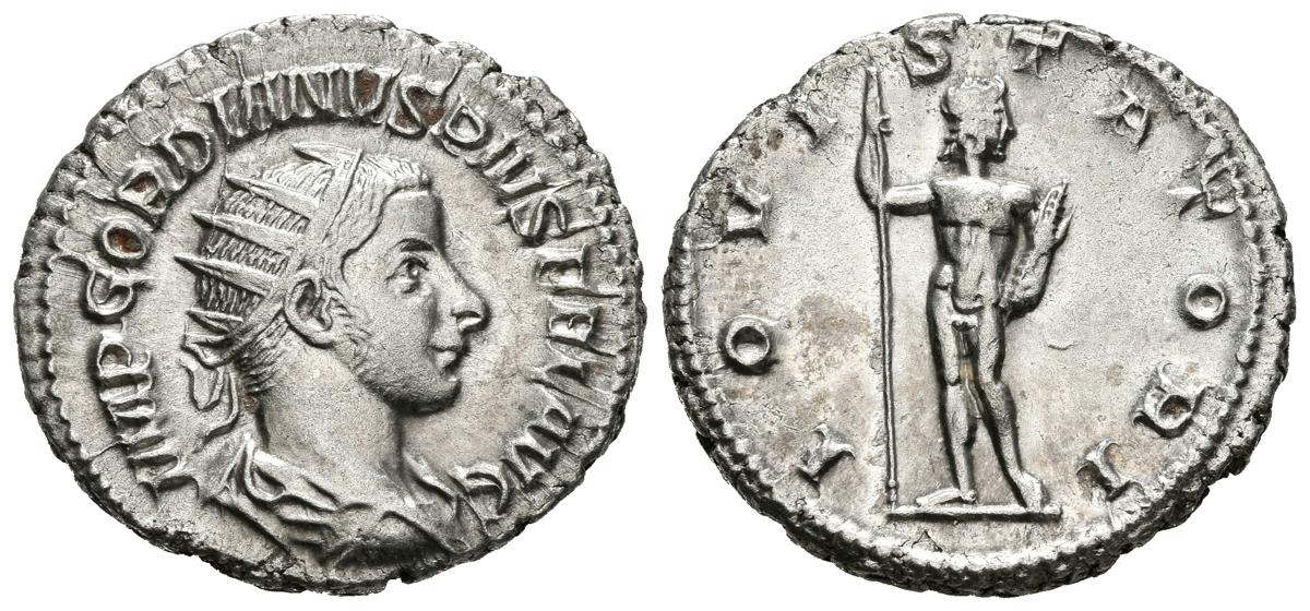GORDIANO III. Antoniniano. (Ar. 4,37g/22mm). 241-243 d.C. Roma. (RIC 84). Anv: Busto radiado y drapeado de Gordiano III a derecha, alrededor leyenda: IMP GORDIANVS PIVS FEL AVG. Rev: Júpiter estante a derecha portando lanza y rayo, alrededor leyenda: IOVI STATORI. MBC+.