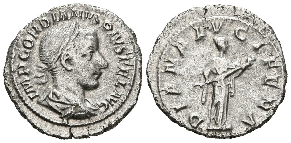GORDIANO III. Denario. (Ar. 2,60g/20mm). 241 d.C. Roma. (RIC 127). Anv: Busto laureado y drapeado de Gordiano III a derecha, alrededor leyenda: IMP GORDIANVS PIVS FEL AVG. Rev: Diana estante a derecha con antorcha encendida, alrededor leyenda: DIANA LVCIFERA. MBC.