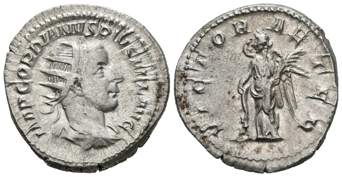 GORDIANO III. Antoniniano. (Ar. 4,51g/23mm). 243-244 d.C. Roma. (RIC 154). Anv: Busto radiado y drapeado de Gordiano III a derecha, alrededor leyenda: IMP GORDIANVS PIVS FEL AVG. Rev: Victoria estante a izquierda portando palma y escudo, alrededor leyenda: VICTOR AETER. MBC.