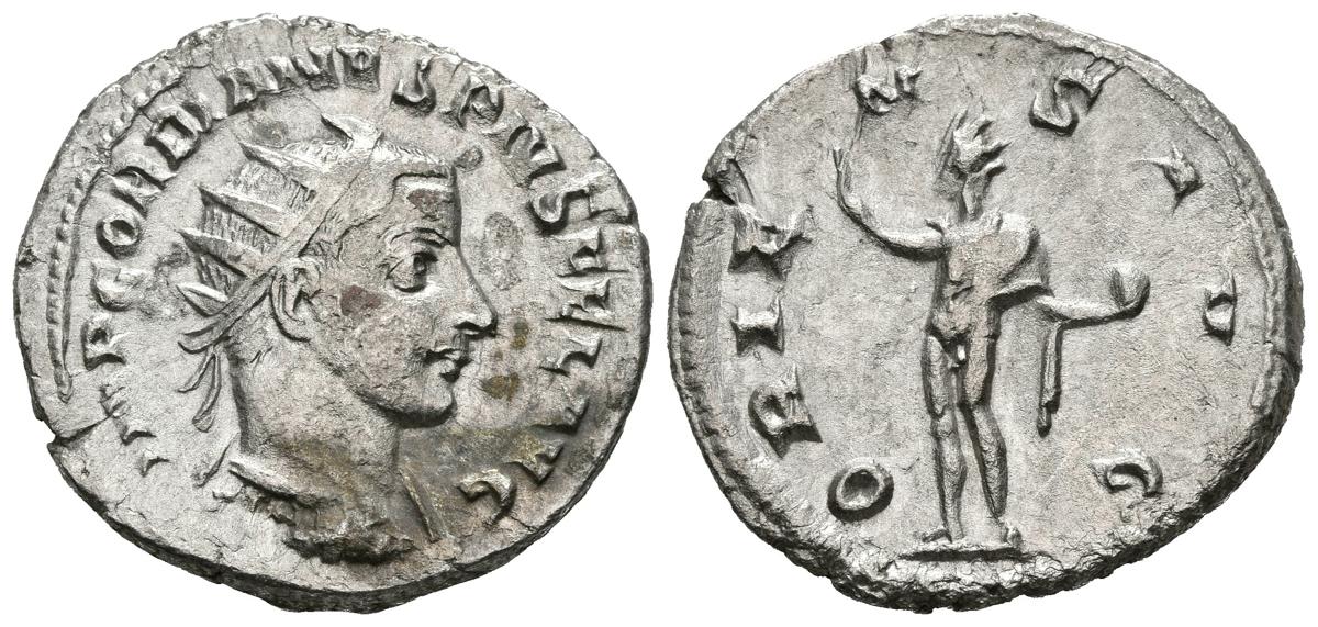 GORDIANO III. Antoniniano. (Ar. 4,72g/23mm). 242-244 d.C. Antioquía. (RIC 213). Anv: Busto radiado y drapeado de Gordiano III a derecha, alrededor leyenda: IMP GORDIANVS PIVS FEL AVG. Rev: Sol radiado estante a izquierda portando globo y alzando mano derecha, alrededor leyenda: ORIENS AVG. MBC.