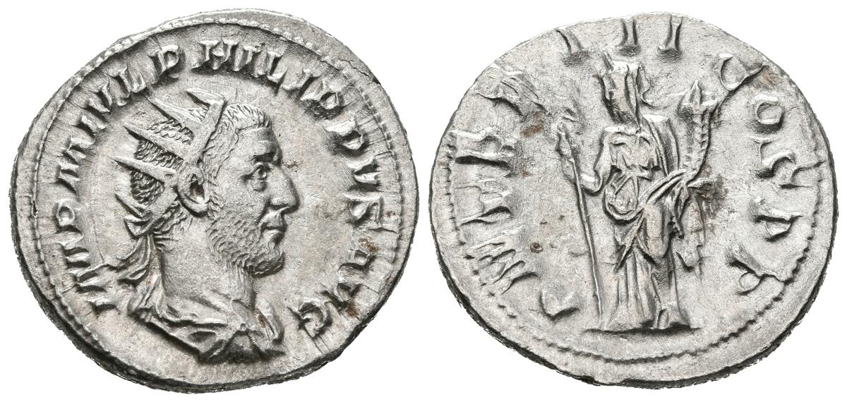 FILIPO I. Antoniniano. (Ar. 4,49g/23mm). 246 d.C. Roma. (RIC 3). Anv: Busto radiado y drapeado de Filipo I a derecha, alrededor leyenda: IMP M IVL PHILIPPVS AVG. Rev: Felicitas estante a izquierda portando caduceo y cornucopia, alrededor leyenda: P M TR P III COS P P. MBC.
